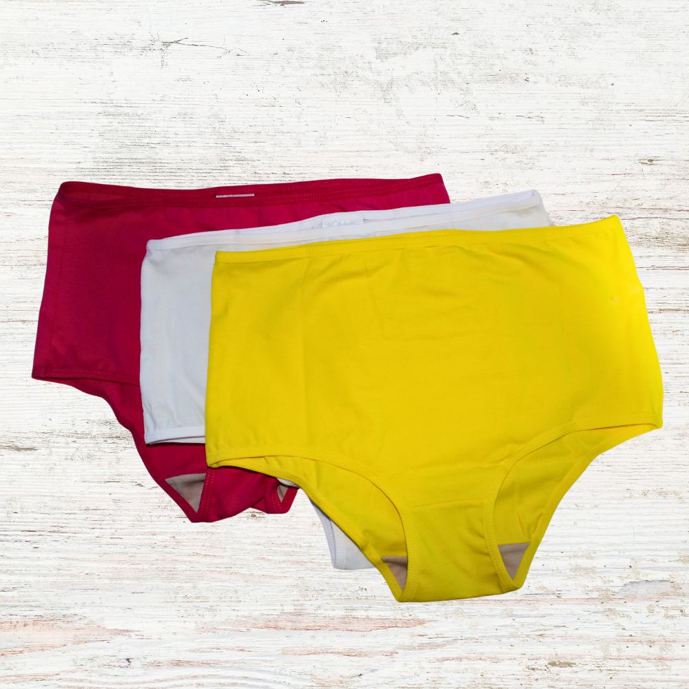 Paquete de pantys estilo cachetero por 3 colores, (amarillo, blanco y magenta) utilizado como protección con un uso especial en los cumpleaños y a final de año.