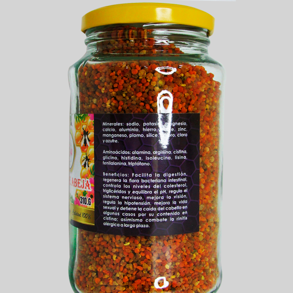 El polen es recolectado por las abejas, de flores y plantas y transportado al panal, para luego ser enriquecido con néctar y enzima sirviendo de base para la alimentación de la colmena. Es por ello que es absolutamente natural por su alto contenido en minerales y aminoácidos, es un complemento alimenticio ideal para el ser humano, entre sus beneficios están la facilidad en la digestión, ayuda a mantener la flora intestinal sana, ayuda a la mejora de enfermedades de base, entre otras propiedades beneficiosas para el organismo, su preparación es muy fácil como es un componente granulado lo pueda agregar a sus ensaladas o batidos preferidos.